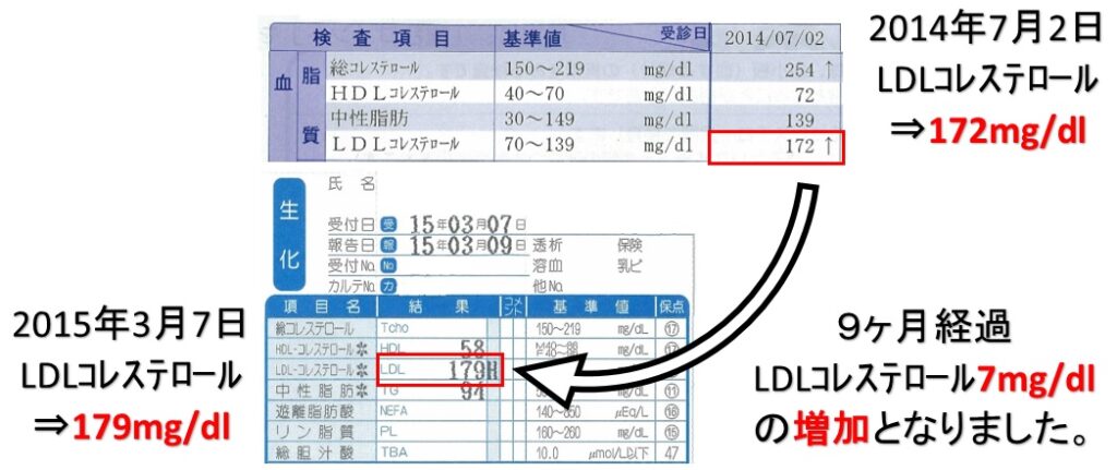 結論!サンスターの緑でサラナを9ヵ月飲み続けたらLDLコレステロール値が、7mg/dl増加となりました。