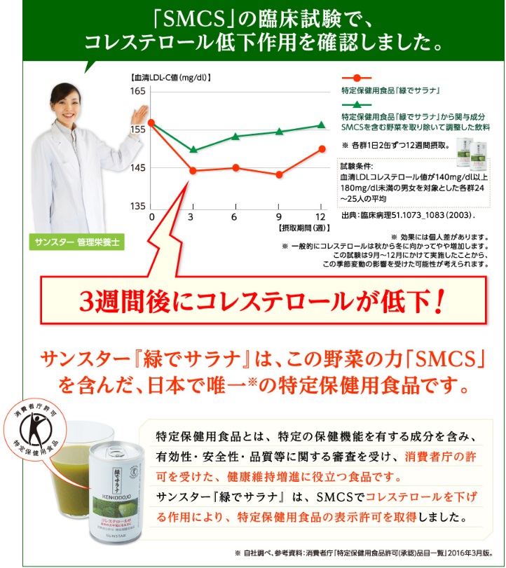 サンスターの『緑でサラナ』は、日本で唯一!血中コレステロールを低下させるトクホです。