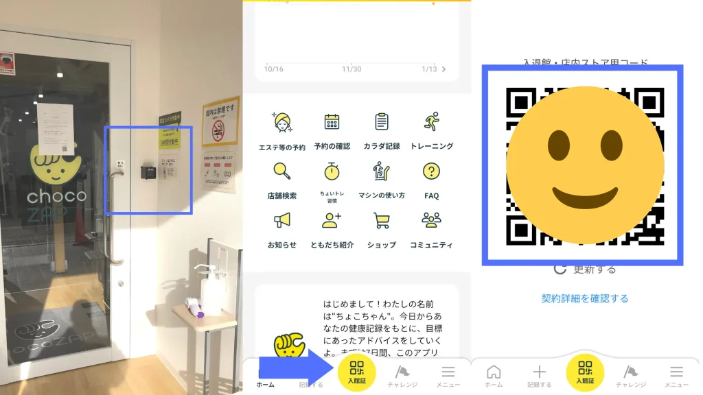 入会後はちょこざっぷアプリ内でQRコードが発行されるので、そちらを店舗入口の横にかざすだけでジムに入れます。