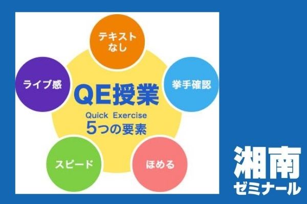 QE授業は、Quick Exerciseの略称で、「テキストなし・挙手確認・褒める・スピード・ライブ感」という5つの要素を持つ湘南ゼミナールオリジナルの授業です。