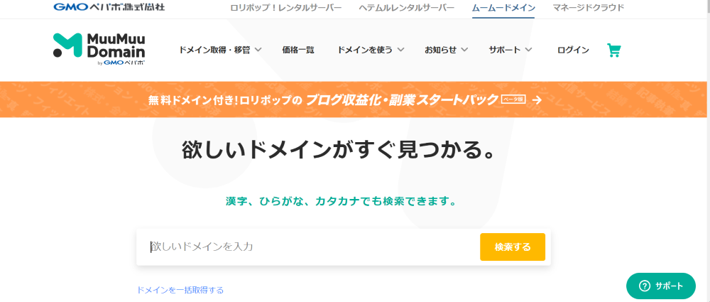 ブログの独自ドメイン取得はGMOペパボ株式会社が運営するムームードメインの利用がおすすめです。同じくGMOペパボ株式会社が運営しているロリポップ!レンタルサーバーと合わせて利用することで、サーバーとの連携がスムーズです。また条件を満たすことで、ドメイン取得代と更新料が無料になります。