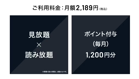 U-NEXTの月額プランは、月額2,189円(税込)で、見放題作品の視聴、雑誌読み放題サービスの利用、1,200ポイントが含まれたサービスプラン。