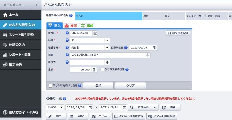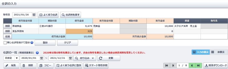 そのため、スクエア決済での売り上げがあった場合は自分で仕訳する必要がなく、やらなければいけないのは実際に銀行口座に入金があった場合の仕訳入力のみとなります。