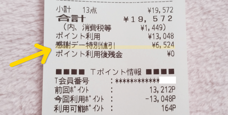 レシートをみてみると「感謝デー特別値引き」でガッツリ割引されていますね。