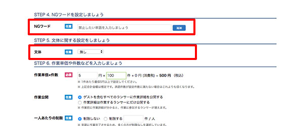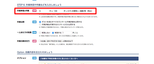 私は作業単価を5円、件数を100件にして、合計500円に設定しました。