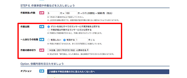 「作業公開」「一人あたりの制限」は任意で、「作業の締め切り」は必須で設定します。