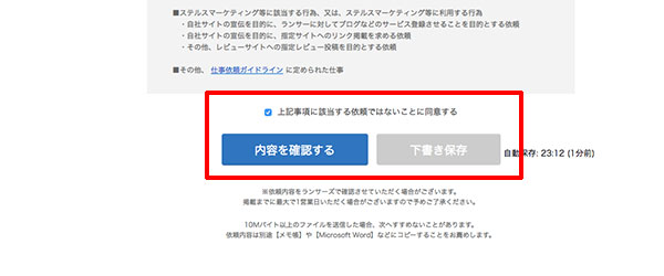 このあと、有料オプションの選択肢が続きますが、必要なければすべて飛ばし、ランサーズの規約に同意した上で、「内容を確認する」を選択します。