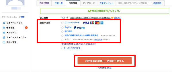 支払い方法を選択して、「利用規約に同意し、依頼を公開する」を選択すれば、アンケートが公開されます。