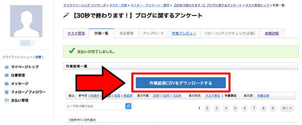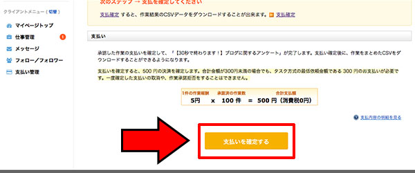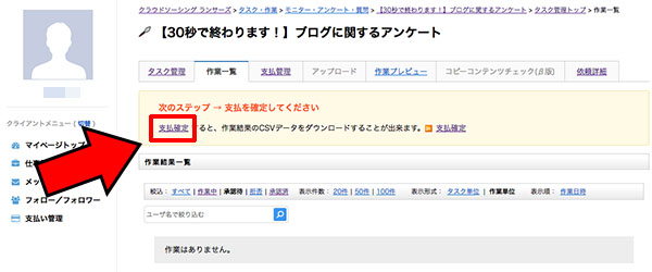 アンケートの承認がすべて終了したら、マイページの作業一覧にある「支払確定」を選択して、ランサーズへの支払いを確定します。
