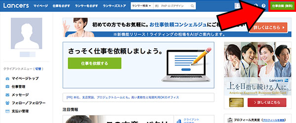会員登録が完了するとマイページに入れますので、「仕事依頼」を選択します。