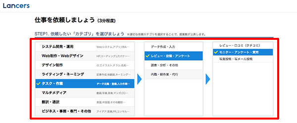 仕事依頼のカテゴリで、「タスク・作業」→「レビュー・投稿・アンケート」→「モニター・アンケート・質問」の順に選択します。