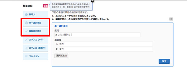 「単一選択項目」は、1つしか選択できないアンケート、「複数選択項目」は複数選択できるアンケートになります。
