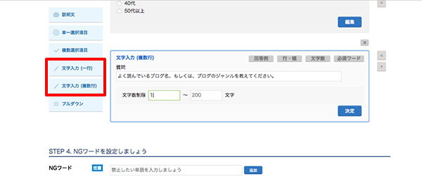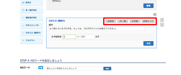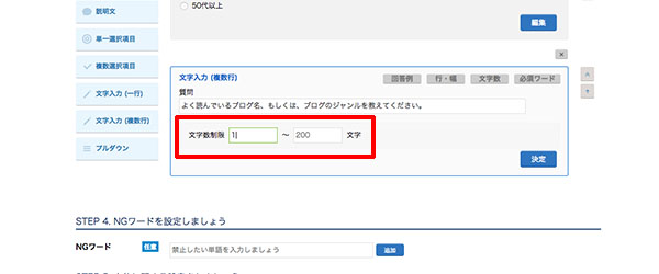 また、「文字入力」のアンケート形式では、「文字数制限」「必須ワード」なども設定できます。