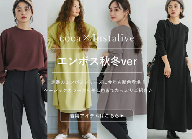 多くの有名ファッション誌に取り上げられている「coca(コカ)」。coca(コカ)には大人女性の”ちょっとおしゃれ”な普段着がリーズナブルな価格で豊富に揃っています。