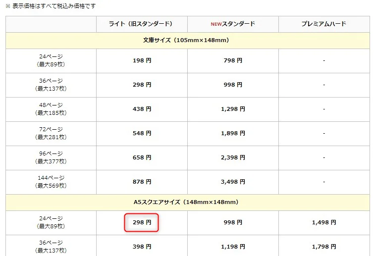 例えば、A5スクエアサイズ、24ページ、ライトを選択すると、「298円」です。