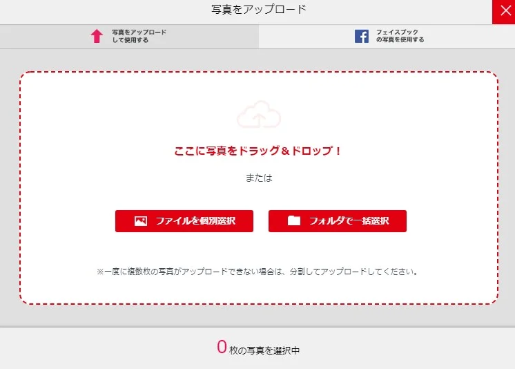 写真をアップロードする画面に変わるので、準備した写真を選択して、アップロードして作成していきます。