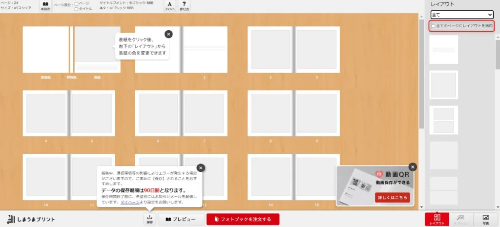一括で同じレイアウトに設定したい場合は、「全てのページにレイアウトを適用」のチェックボックスがあるため、一括で同じレイアウトの適用ができます。