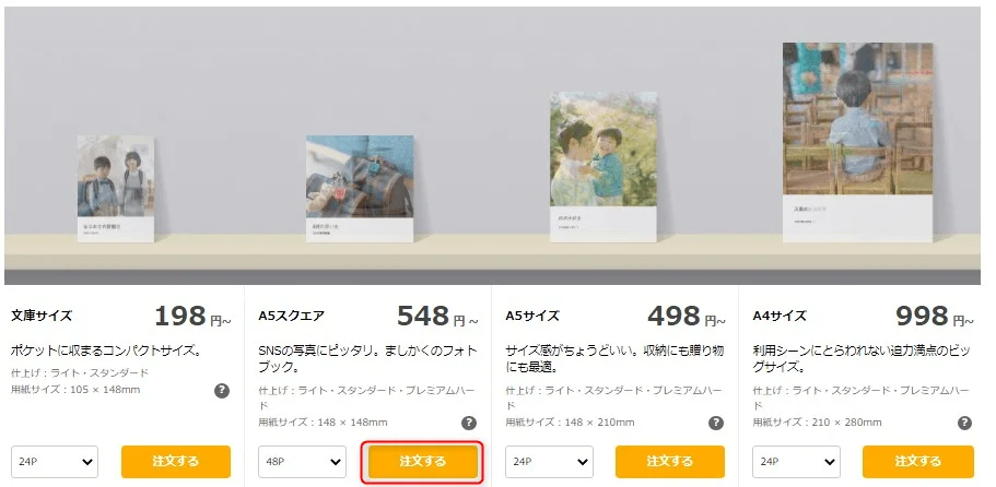 | A5スクエアサイズ(48ページ) (最大185枚) プレミアムハード | 1,998円 | 2 | 3,996円 |