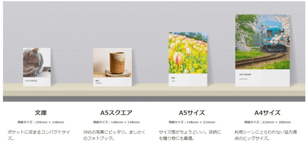 しまうまプリントのフォトブックのサイズは、文庫、A5スクエア、A5サイズ、A4サイズから選択できます。