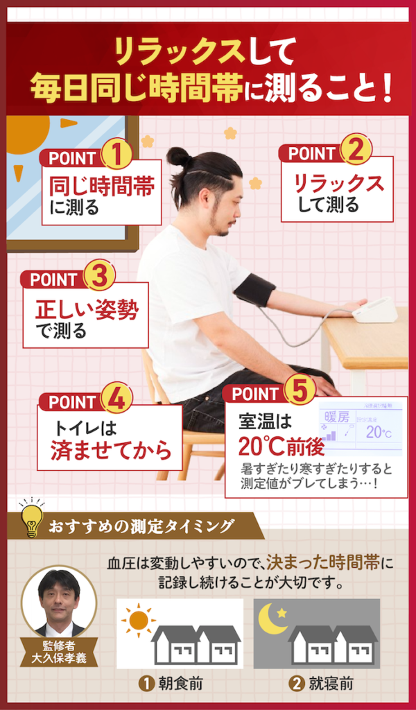 血圧は1日のなかで変動しやすいため、長期的に測定してデータを取ることが大切です。加えて、日本高血圧学会が推奨している、朝食前と就寝前の毎日決まった時間帯に測定しましょう。