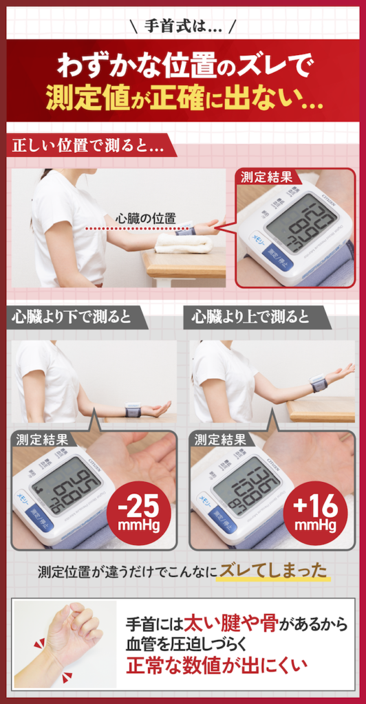手首には血管が2本あるうえ、腱や骨があるため圧迫がしづらく、適切に圧迫するのが難しい場所です。さらに、手首の曲げ具合や振動によって測定結果に影響が出やすいといわれています。