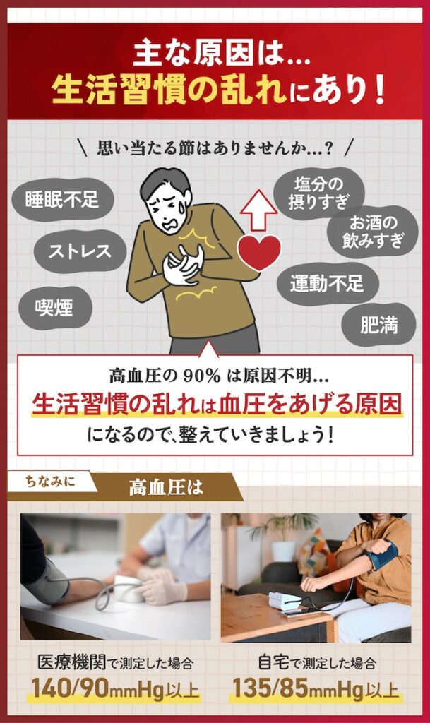 高血圧の90%は明確に原因が特定できておらず、睡眠不足・荒れた食生活・運動不足・喫煙などの生活習慣の乱れが複数組み合わさって発症すると考えられています。さらに、高血圧は自覚症状がほとんどなく自分では気付きづらい病気。そのため、生活習慣を整えて血圧の上昇を抑え、定期的に健康診断を受けたり家庭用血圧計で毎日測ったりすることが大切です。