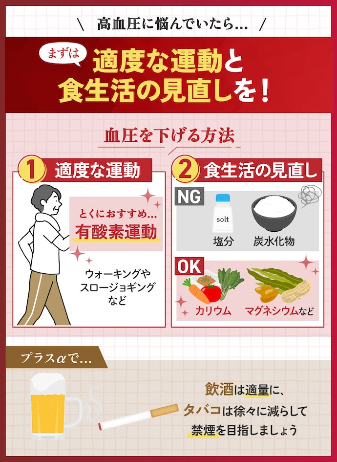 高血圧の原因は生活習慣の乱れに大きく関係していますが、なかでも改善しやすいのは運動不足と食生活の乱れ。血圧を下げるためなら、有酸素運動を日々の生活に取り入れたり、食生活を見直して果物を意識的に摂取したりすることから始めましょう