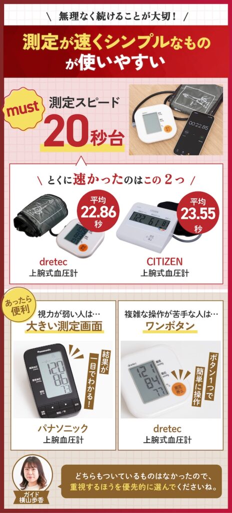 ② 測定スピードは20秒台のものを選ぼう。大きい画面やワンボタンのものだと便利