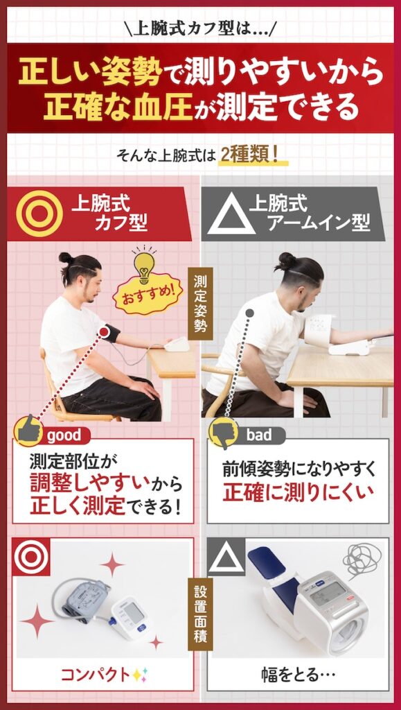 上腕式の血圧計には上腕式カフ型と上腕式アームイン型がありますが、測定値の安定性で選びたい人は上腕式カフ型を選びましょう。正しい姿勢で測りやすく、正確な血圧値が出るといわれています。設置面積が小さく幅もとらないため手軽に測定できますよ。