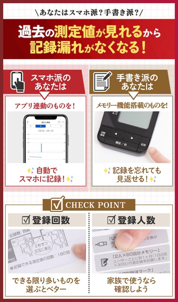 また、これらの機能は商品によってメモリー登録回数や登録人数が異なります。アプリや本体に毎日の記録を残したい人は登録回数が多いものを、家族で使いたい人は登録人数を必ず確認しておきましょう。