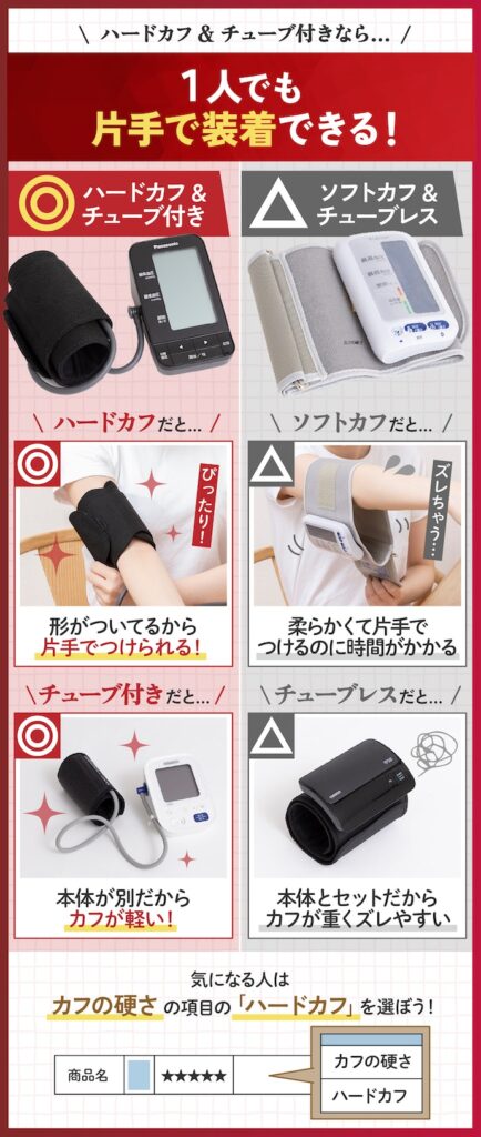 上腕式カフ型のものを選ぶ際には、ハードカフかつチューブ付きのものが自分で装着しやすいのでおすすめです。