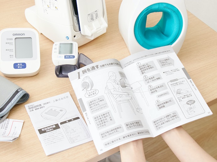 足を組んだり、前のめりになったりしないように姿勢を正して測定を行いましょう。また、測定部位が心臓の高さになるよう、机が低い場合は本やクッションなどで高さを調整して測ってくださいね。