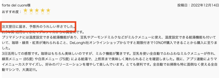 注文した商品を一刻も早く使いたい。これは多くの方が思うことではないでしょうか?その思いに答えてくれることは、デロンギ公式オンラインショップを利用するメリットの1つと言えるでしょう。