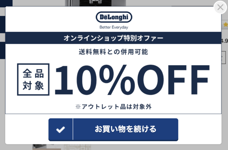 デロンギが運営する公式ショップでは、全品対象10%OFFクーポンがランダムに発行されます。