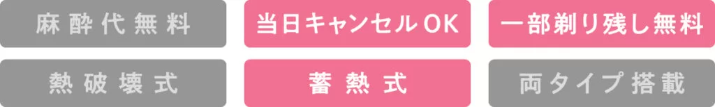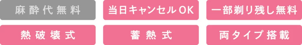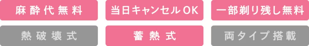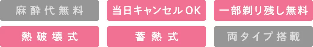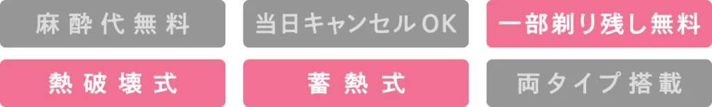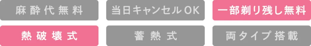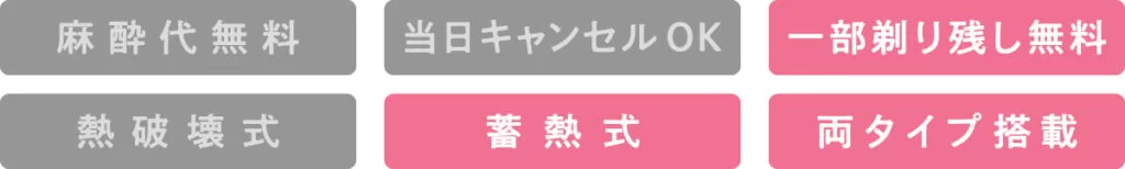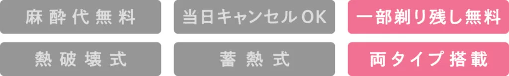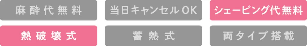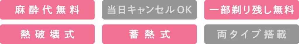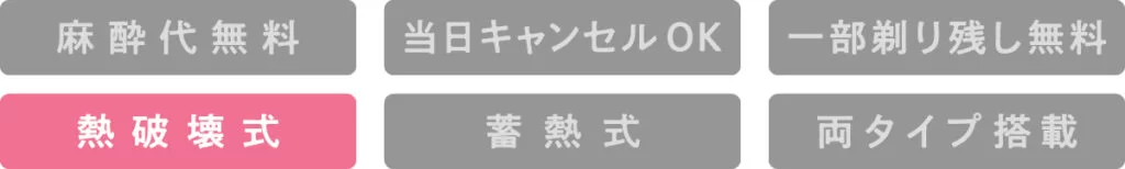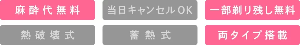 | 脱毛機 | 熱破壊式/蓄熱式(切り替え可能):ラシャ 熱破壊式:ジェントルヤグプロ 蓄熱式 :メディオスターNeXT PRO | |