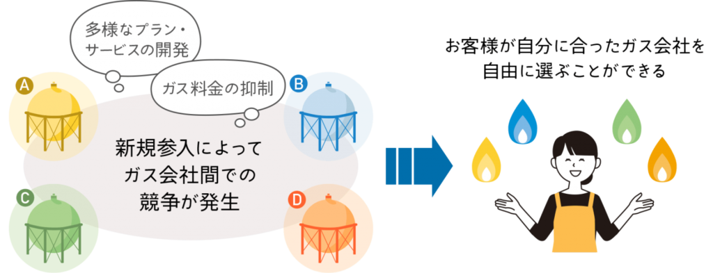ガスの販売を行う業者の増加により競争が活発化し、料金プランやサービスで差をつける事業者が増えることで、ガス料金を安くすることに繋がりました。