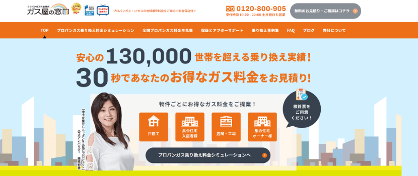 プロパンガス(LPガス)の料金比較シミュレーションができ、家庭ごとに最適なプロパンガス会社を紹介してくれます。 最大で年間5万円以上もガス料金を節約できる場合もあり、まずは「ガス屋の窓口」での無料相談がおすすめ!