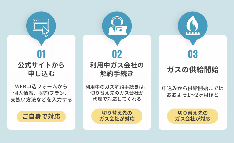 現在使用中のガス会社へ解約手続きは、切り替え先のガス会社が代理で対応してくれます。 同時に、切り替え先のガス会社への手続きを進めてもらえるので、申し込み者の手間はかかりません。