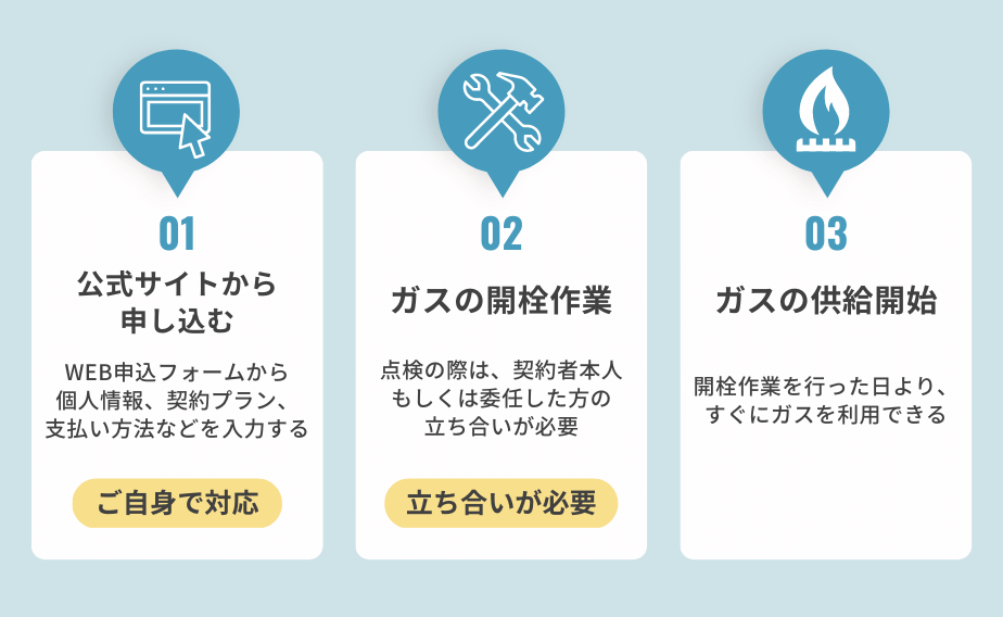 実は、ガス会社の申し込みや切り替えはとても簡単です。 また、契約中のガス会社への解約手続きは、新しく契約するガス会社が代わりに対応してくれます。詳しい申し込みの手順をチェックしましょう!